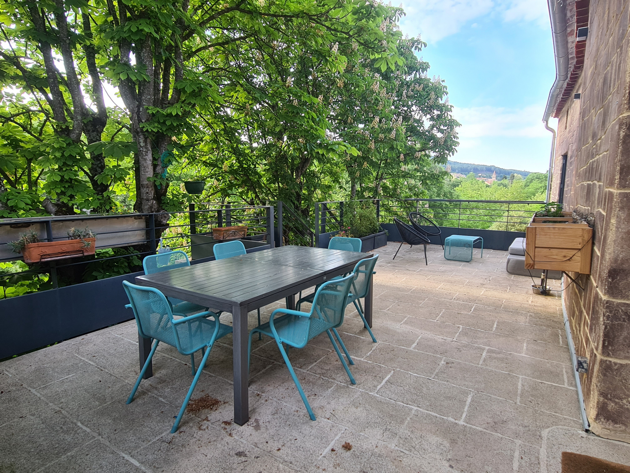 Au premier étage un grand salon séjour donnant sur une terrasse avec une vue sur la forêt, trois chambres, une salle de bain/salle d'eau