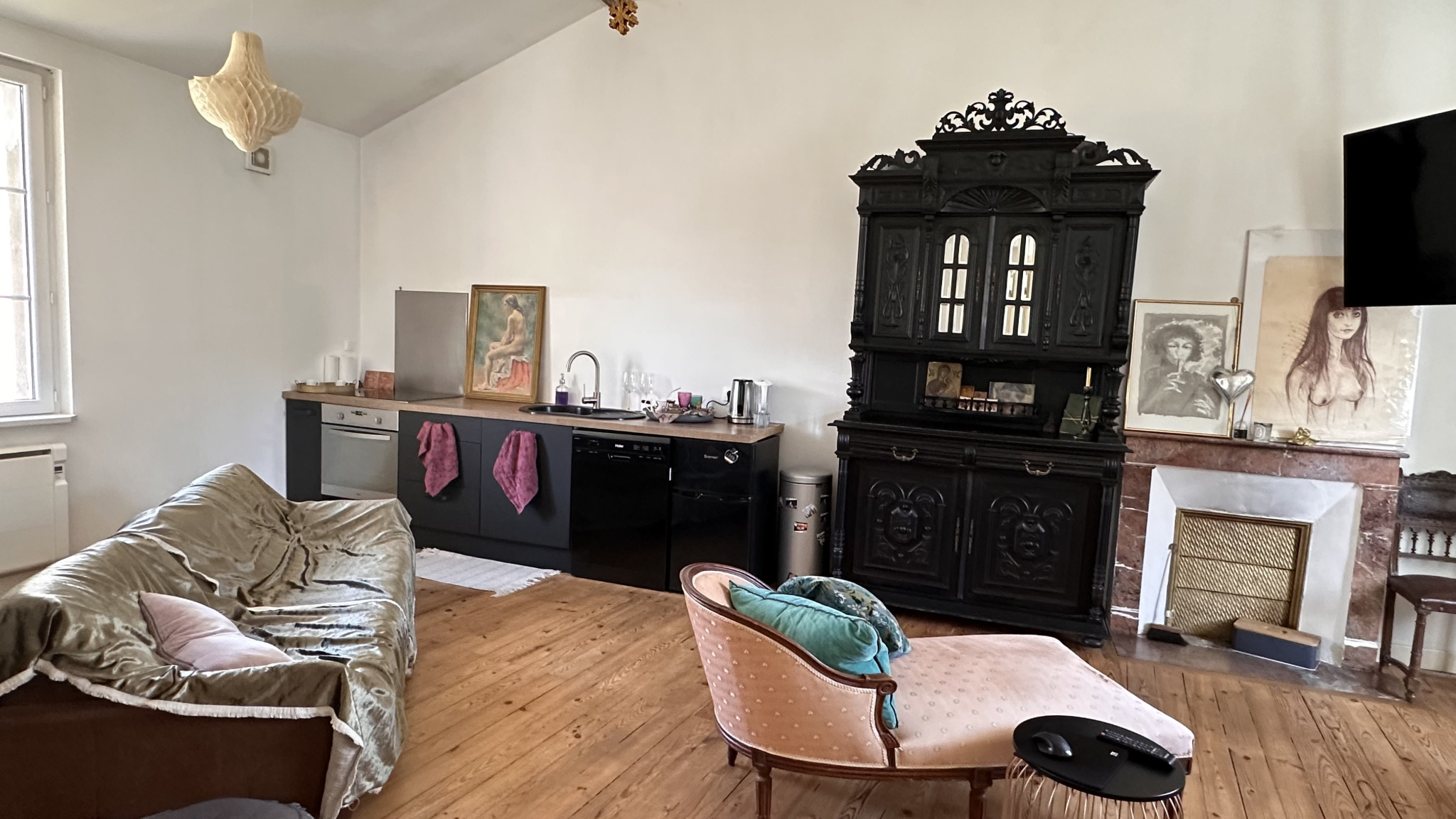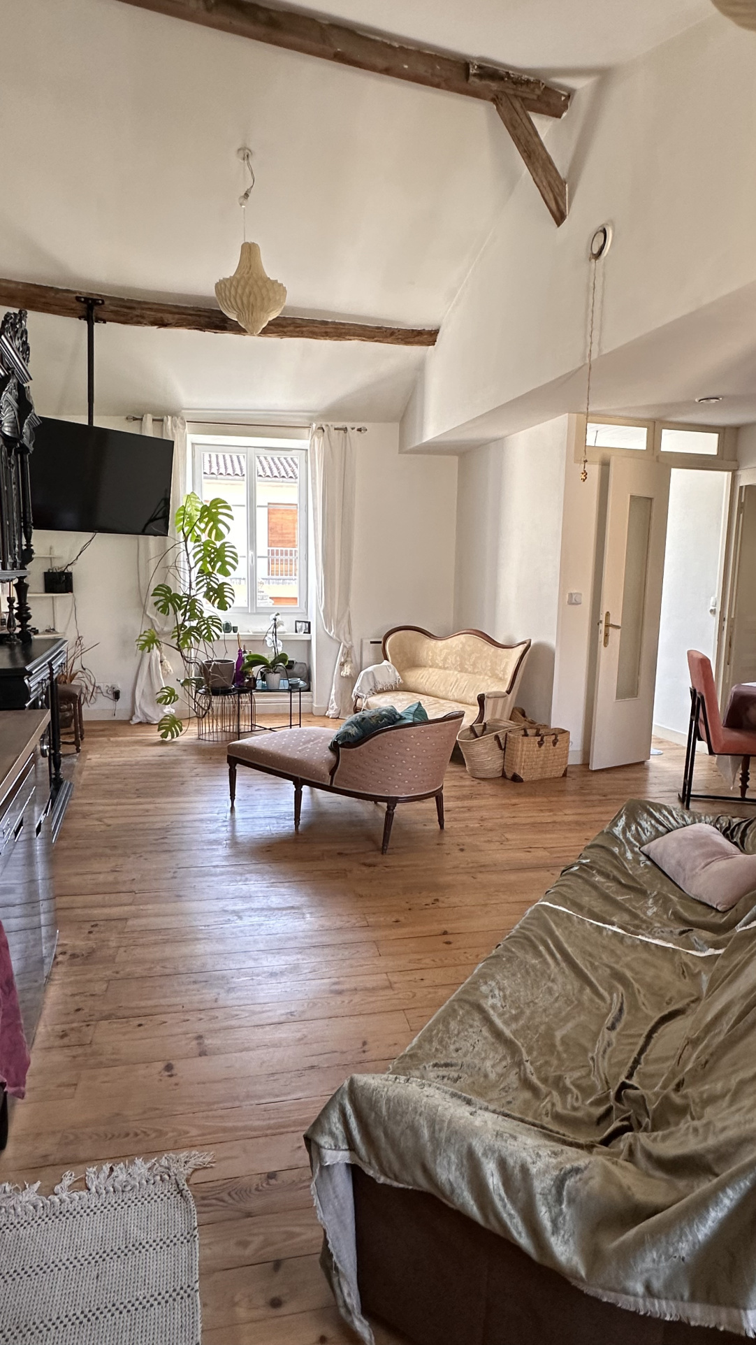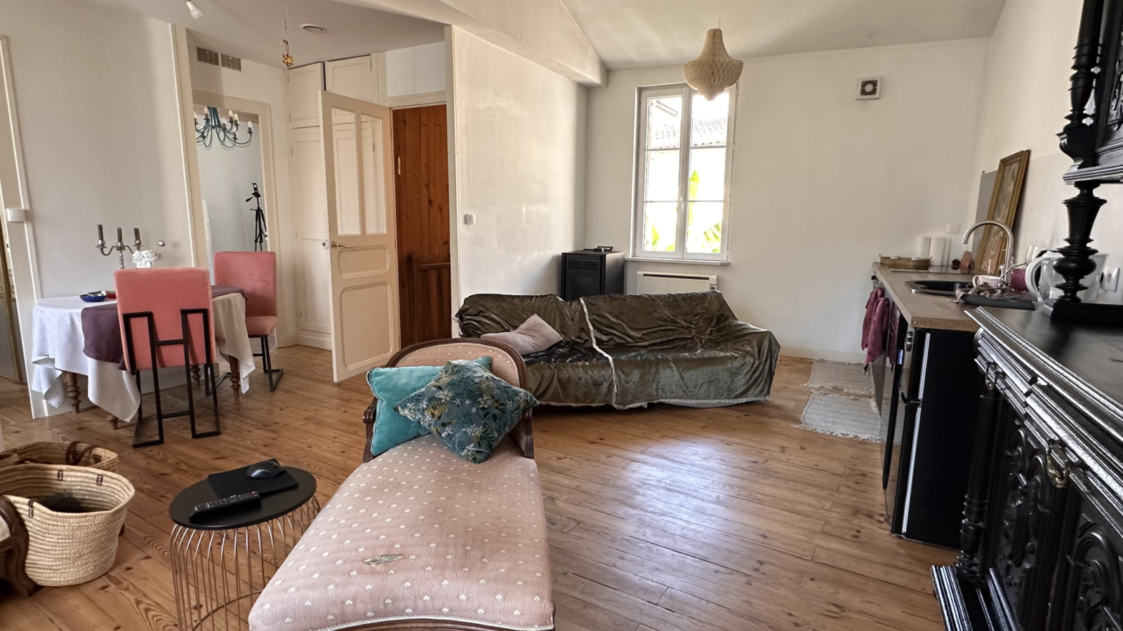 L'intérieur est charmant ,très bien rénové , offrant un vrai confort ( panneaux solaires, poêle à granulés DPE C)avec une belle lumière dans les 2 pièces de vie... les sols sont de belles qualité .... à vous de moduler selon vos envies.