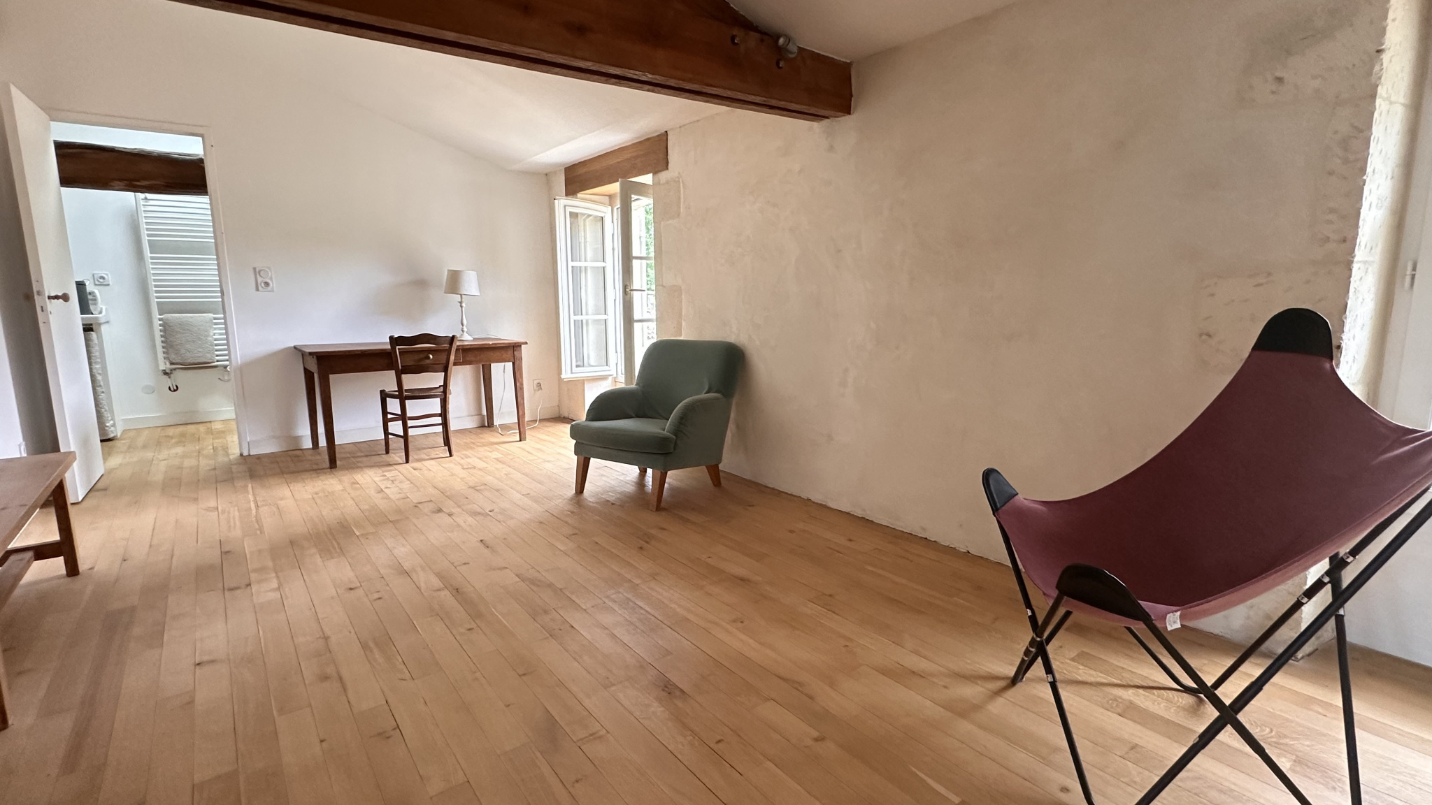 Grand loft au deuxième étage avec sa charpente apparente.