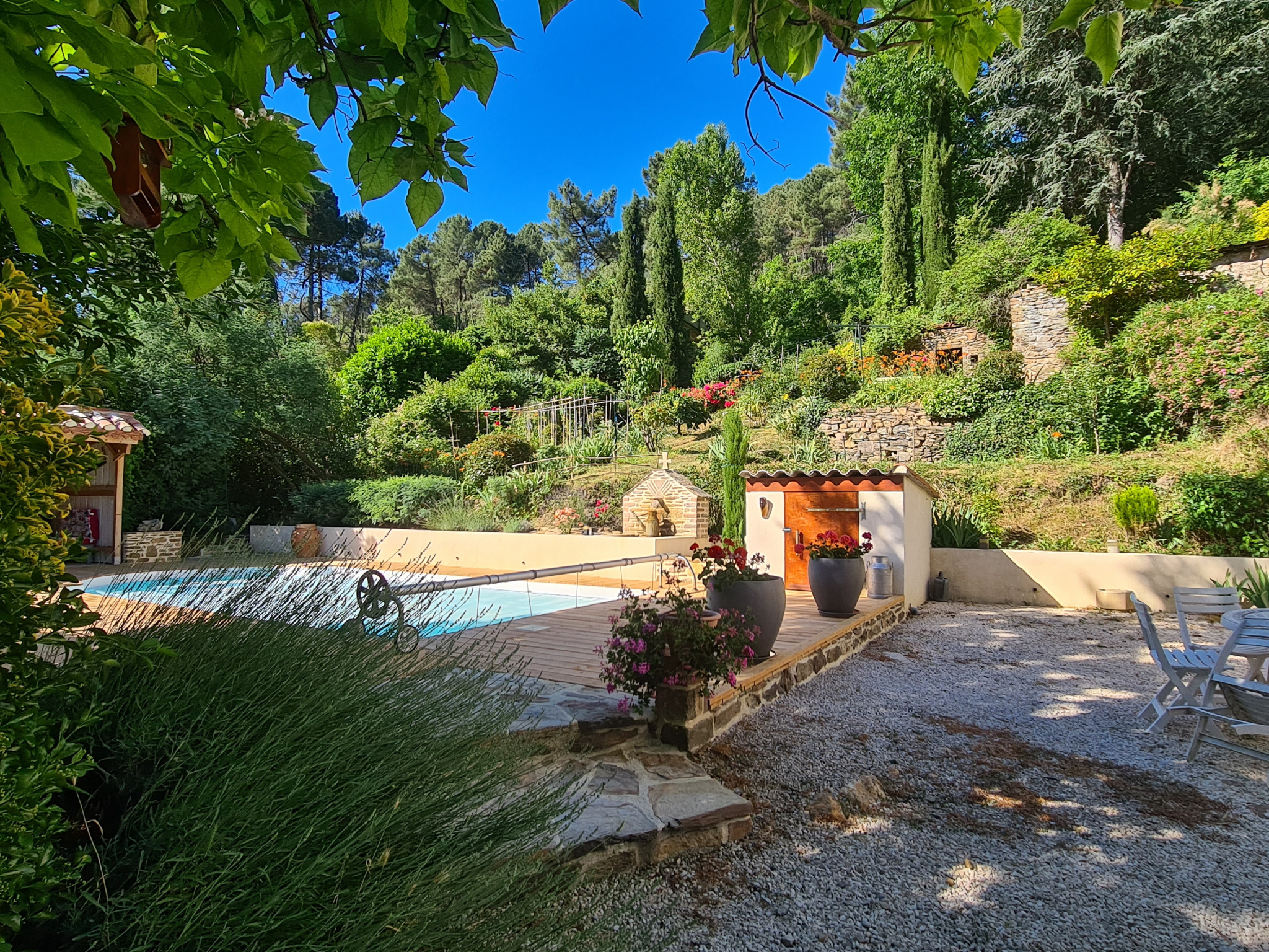 Le terrain est d'une superficie de 9 700 m² environ dont une grande partie en montagne sur lequel se trouve une piscine avec un pool house de 15 m²