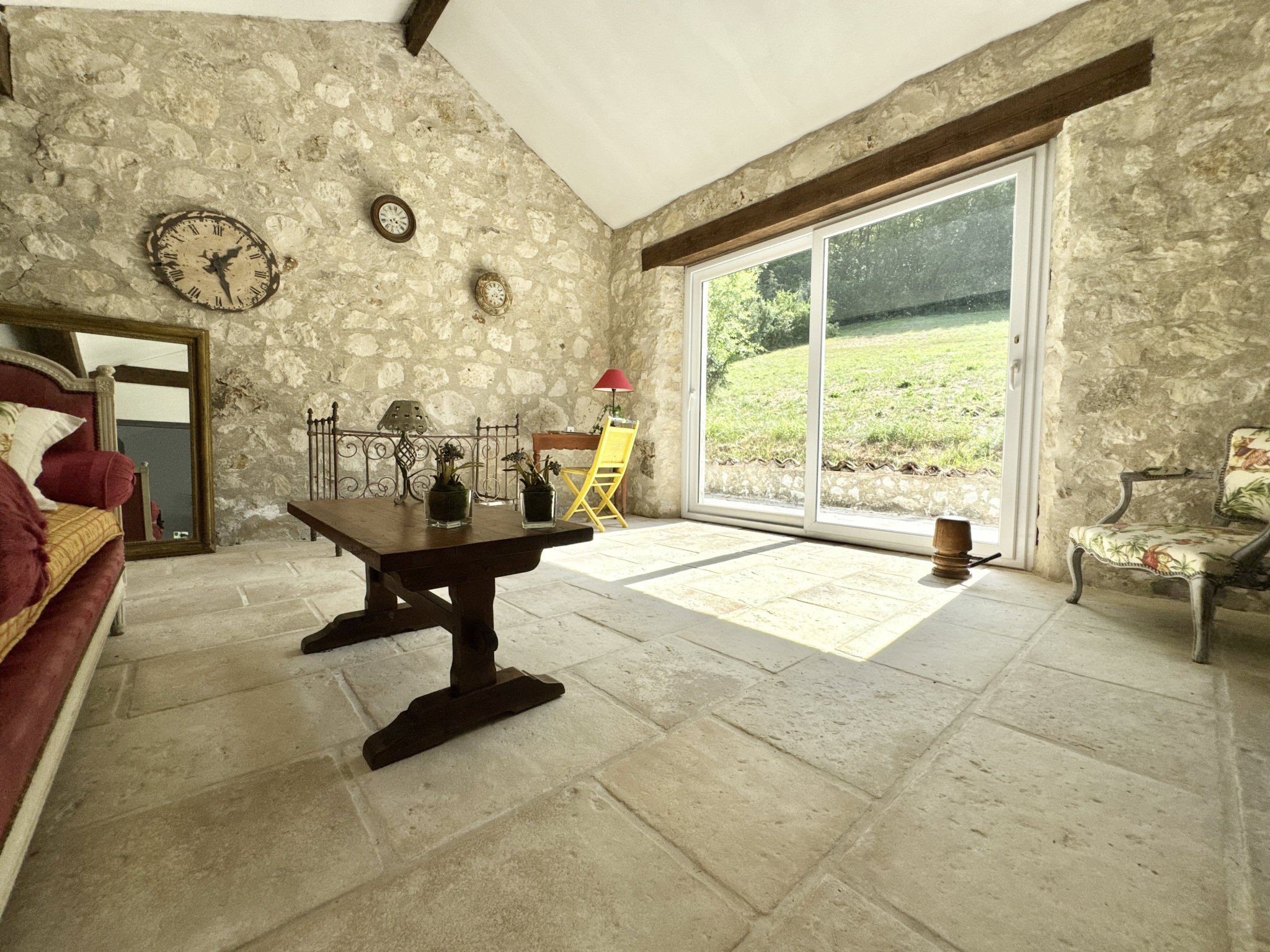 On découvre avec surprise cet ensemble en pierre, comprenant une maison d’habitation d’une surface totale de 192 m² avec entrée sur salon salle à manger cheminée ouverte de 45,45 m², cuisine séparée de 16 m², une première chambre de plain-pied de 16 m² avec salle d’eau attenante de 6 m² et WC indépendants.